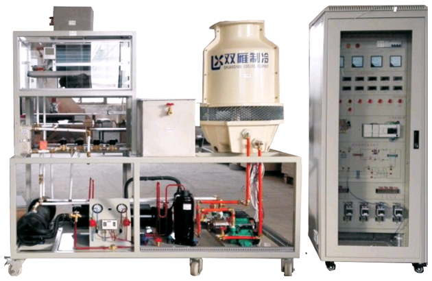 蓄冷空調(diào)制冷技術(shù)實(shí)訓(xùn)裝置是利用夜間低谷負(fù)荷電力制冰儲(chǔ)存在蓄冰裝置中,白天融冰將所儲(chǔ)存冷量釋放出來(lái),減少電網(wǎng)高峰時(shí)段空調(diào)用電負(fù)荷及空調(diào)系統(tǒng)裝機(jī)容量,它代表著當(dāng)今世界中央空調(diào)的發(fā)展方向。該實(shí)訓(xùn)裝置是根據(jù)《蓄冷空調(diào)系統(tǒng)原理、工程設(shè)計(jì)及應(yīng)用》、《蓄能空調(diào)技術(shù)及其發(fā)展》等課程的實(shí)踐教學(xué)而開(kāi)發(fā)設(shè)計(jì)的新型實(shí)訓(xùn)設(shè)備。整個(gè)裝置采用直接蒸發(fā)制冰系統(tǒng),系統(tǒng)主要由制冷機(jī)組、蓄冰裝置、空調(diào)末端裝置、空調(diào)循環(huán)水泵、乙二醇泵、載冷劑(乙烯乙二醇水溶液)等組成。適合各院?照{(diào)工程專業(yè)、建筑環(huán)境與設(shè)備工程等專業(yè)相關(guān)課程的實(shí)訓(xùn)教學(xué)。