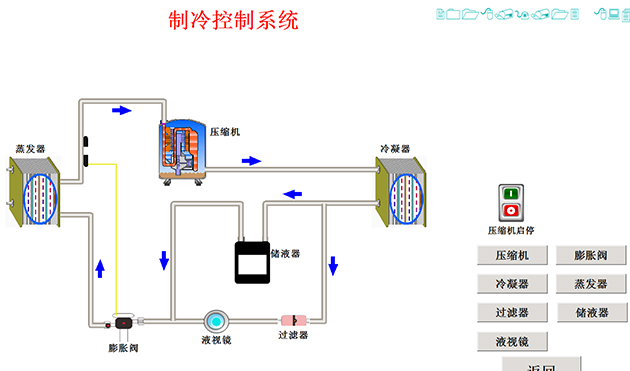 5、工作流程圖板3套:工作流程圖板詳細(xì)說明制冷系統(tǒng)流程、監(jiān)測(cè)點(diǎn)溫度、系統(tǒng)壓力、工作狀態(tài)指示、系統(tǒng)部件說明。