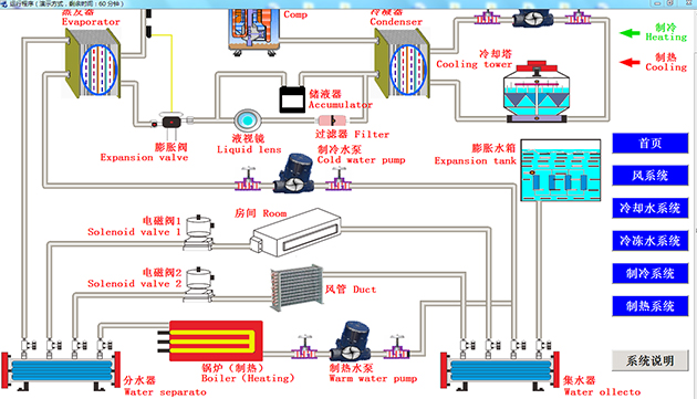(2)、是系統(tǒng)動(dòng)畫演示:如壓縮機(jī)系統(tǒng)、制冷系統(tǒng)、制熱系統(tǒng)、風(fēng)系統(tǒng)、集中送風(fēng)系統(tǒng)、半集中送風(fēng)系統(tǒng)的原理過程。