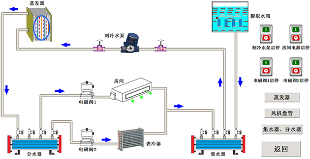 (1)、系統(tǒng)主要部件說明組成:如壓縮機(jī)、卻水泵、冷卻風(fēng)機(jī)、風(fēng)機(jī)盤管、分水器、集水器、表冷器等。
