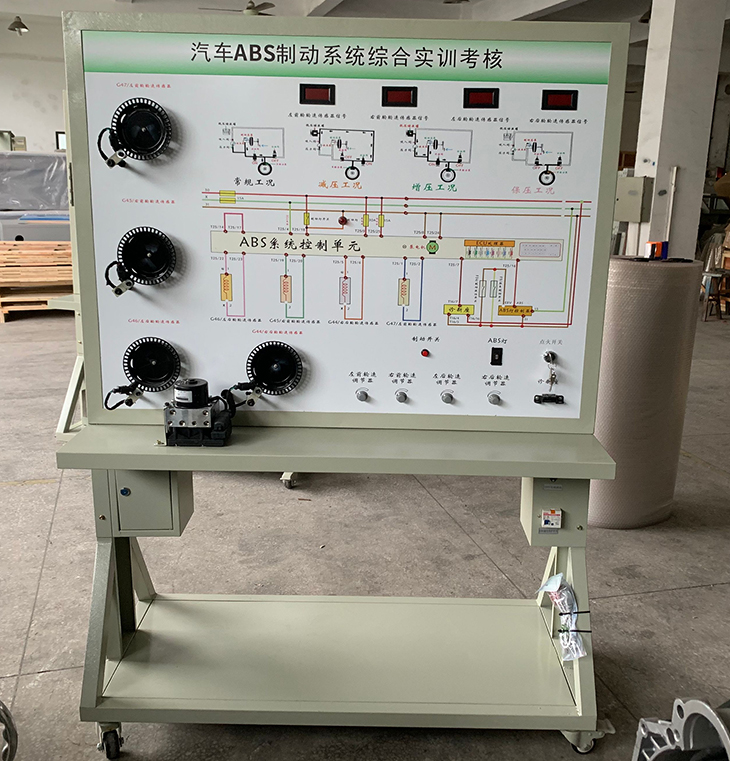 ABS控制單元、ABS電磁閥總成、輪速傳感器、制動開關(guān)等。檢測端子、故障設(shè)置系統(tǒng)、大容量蓄電池或12V開關(guān)電源、大型彩色噴繪電路原理圖、控制面板、可移動臺架、使用說明書及任務(wù)驅(qū)動式實訓指導書等。