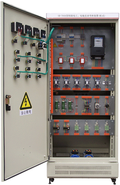 初級電工電拖實訓(xùn)考核裝置,初級電工考核柜,初級電工實訓(xùn)考核裝置是按照勞動社會保障部頒發(fā)的“工人技術(shù)等級標(biāo)準(zhǔn)”和“職業(yè)技能鑒定規(guī)范”的內(nèi)容要求,根據(jù)初級電工培訓(xùn)考核的實際情況而設(shè)計的新一代集培訓(xùn)學(xué)習(xí)、理論驗證、實際操作能力、考核鑒定于一體的多功能柜式設(shè)備。整臺設(shè)備以標(biāo)準(zhǔn)的電氣控制柜為主柜,利用柜體的雙面空間,布置電器 及配套實驗器材,能完成初級電工考核鑒定中的電力拖動控制與照明電路的實操項目,該電工、電拖實訓(xùn)考核裝置堅持理論聯(lián)系實際的原則,突出技能訓(xùn)練,注重針對性、實用性、科學(xué)性,經(jīng)全國多家職業(yè)技能訓(xùn)練中心、職校、技校使用證明,該柜體設(shè)計合理、實操方便,占地面積少。為延長電器的使用壽命,各電器的接點都與接線端子相連,再讓學(xué)生在接線端子上接線,連接電機、電器來完成各項控制實驗,有效降低材料消耗,延長使用壽命。該套設(shè)備適用于各勞動職業(yè)技能鑒定部門,同時適應(yīng)各大、中專、技校、職校初級電工、電拖專業(yè)教學(xué)與實訓(xùn)考核。