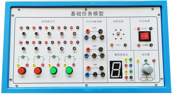 該任務(wù)盒有1.2mm優(yōu)質(zhì)鋼板加工噴涂制作,面板有鋁板加工沖孔而成,表面貼膜制作,配置有直流電機(jī)、7段數(shù)碼管、彩燈組、繼電器組、按鈕組、電位器等,能滿足對PLC教學(xué)基礎(chǔ)任務(wù)指令的學(xué)習(xí)與應(yīng)用。
