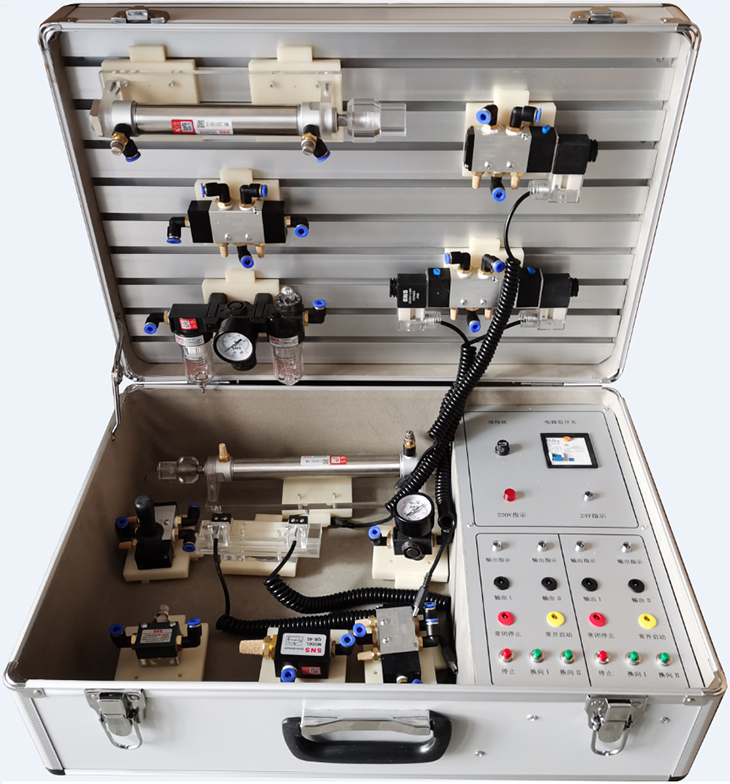 1、實訓(xùn)箱主要由鋁合金機(jī)箱、各種標(biāo)準(zhǔn)氣動工業(yè)元件、和電氣控制器件等組成。