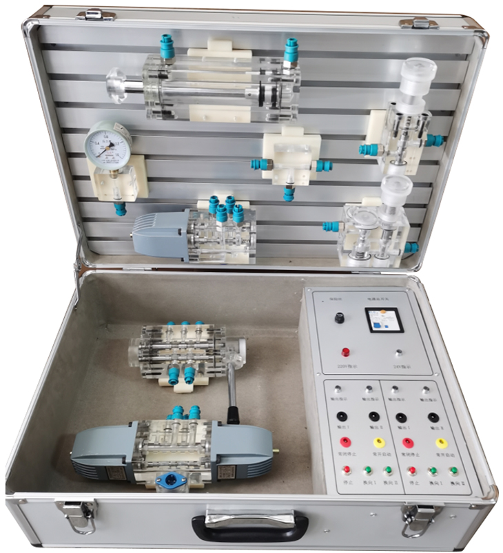 3、箱子集元件元件、液壓泵站、調速電機及電氣控制部分為一體箱,教師可方便的將設備帶入課堂進行現(xiàn)場演示教學和實物講解。