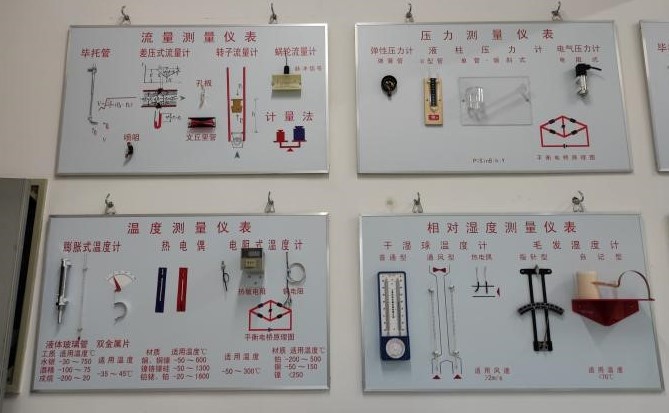 多種熱電偶等實物或模型組成,并在每類儀表下面畫有材質(zhì)和使用適用溫度范圍的表格和工作原理圖
