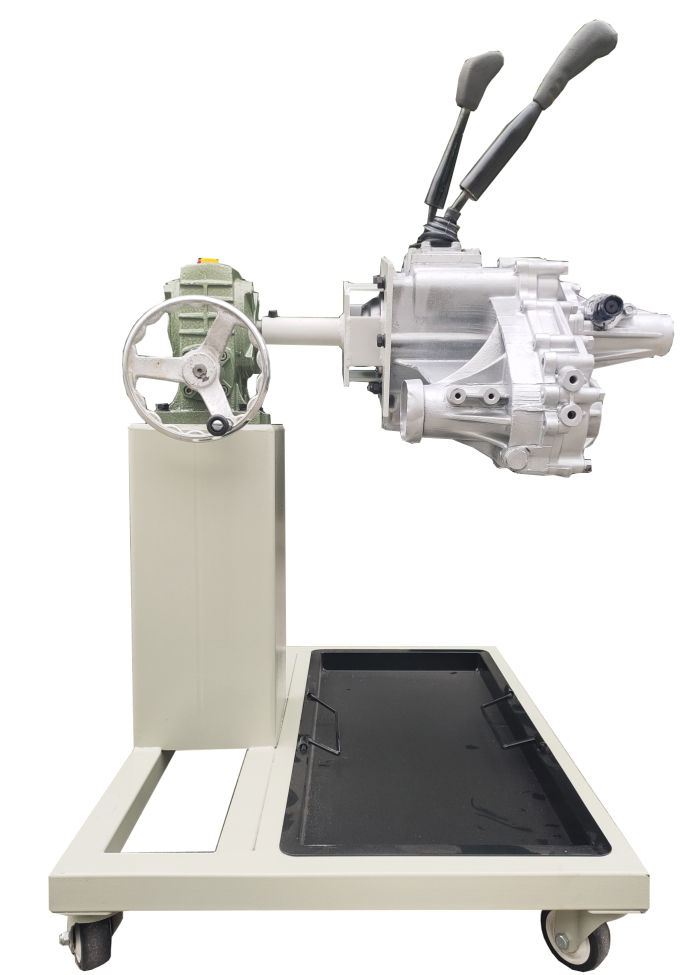 采用減速翻轉(zhuǎn)機構(gòu),可使分動箱旋轉(zhuǎn)任意角度,并能任意位置鎖止,便于學(xué)生從不同的角度進行拆卸和裝配。