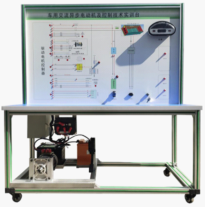 檢測控制面板(裝有各種檢測端子,1448×940mm彩色電路圖和工作原理示意圖)、組合儀表、點火開關、電機控制器、車載充電器與充電接口、DC-DC轉換器、鋰動力電池組、電動車電機(交流異步電動機)、剎車開關、檔位開關、油門控制裝置、大電流繼電器、電源總開關、急停開關、輔助蓄電池(12V45AH)、一體化全鋁合金型材搭建的移動臺架(1500×700×1700mm (帶自鎖腳輪裝置,帶安裝檢測端子的原理面板,面板1448×940mm)、設備操作說明書。