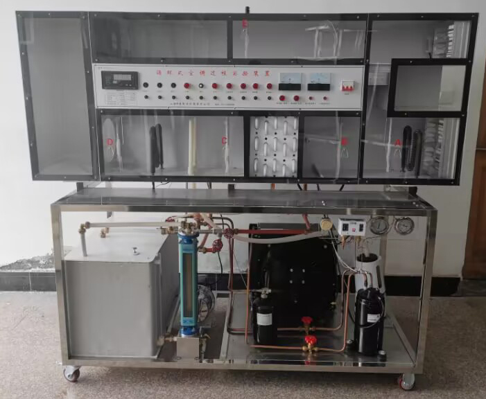 空氣熱濕處理實驗裝置為《空氣調節(jié)》課程實驗教學設備,用它可以模擬不同季節(jié)室內和室外的環(huán)境和空氣處理調節(jié)的方法,進 行集中式空調系統(tǒng)不同循環(huán)形式的空氣調節(jié)實驗。還可以 做變風量運行調節(jié)實驗和制冷系統(tǒng)的參數(shù)測定及其調節(jié)實驗。裝置具有透明風管,可直觀地觀察和測試。實驗裝置的 結構由空氣循環(huán)系統(tǒng)、加濕器、加熱器、冷卻器及其冷水 機組和相應的測試儀表等組成?梢詫崿F(xiàn)對空氣的加熱、冷卻、加濕和除濕(表冷式和淋水式可互換使用)等處理。 在實驗中,還可以對空氣的溫度、濕度、流量進行測量,并 能對加溫器、加熱器的輸入電功率進行測定,從而可以計算各空氣處理過程中的熱量和濕量得失,以及進行熱、濕平衡 的分析。