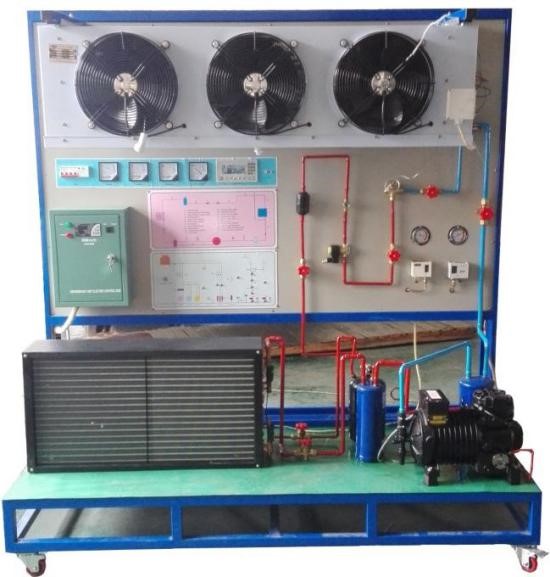 工業(yè)制冷系統(tǒng)實(shí)訓(xùn)考核裝置主要由半封閉式制冷壓縮機(jī)、冷凝器、蒸發(fā)器、膨脹閥和故障設(shè)置開關(guān)、測(cè)試儀表等組成。實(shí)訓(xùn)臺(tái)通過手閥開關(guān)和鈕子開關(guān)分別來設(shè)置管路系統(tǒng)和電控系統(tǒng)的 20 多種故障。設(shè)備采用先進(jìn)的電控系統(tǒng)并具有具有開相,缺相, 過流等保護(hù)功能。蒸發(fā)器風(fēng)扇采用變頻器控制速度。配備 8 路溫度計(jì),電壓表,電流表,功率表,功率因數(shù)表和壓力表,能實(shí)時(shí)觀察運(yùn)行參數(shù)