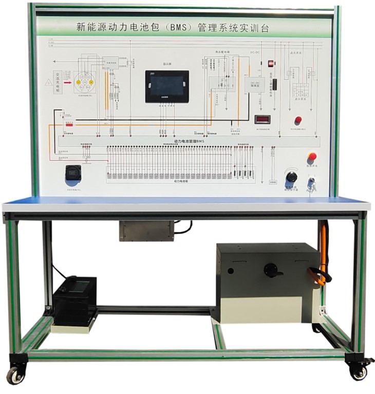 磷酸鐵鋰動(dòng)力電池包與鐵制電池箱(單體電池3.2V 20AH,24串)、BMS鋰電管理一體機(jī)、動(dòng)力電池包觸摸顯示屏、車載充電機(jī)、國標(biāo)充電插口、國標(biāo)充電槍、緊急斷電開關(guān)、霍爾電流傳感器、直流接觸器(包含充電繼電器、總正繼電器、總負(fù)繼電器、預(yù)充繼電器)、DC-DC轉(zhuǎn)換器(72V-12V30A)、輔助蓄電池(12V45AH)、放電控制繼電器與放電負(fù)載電阻、預(yù)充電阻器、可移動(dòng)實(shí)訓(xùn)臺(tái)(1500×700×1700mm 帶自鎖腳輪裝置,帶安裝檢測(cè)端子的原理面板,面板1448×940mm)、故障模擬與排除裝置、設(shè)備操作說明書。