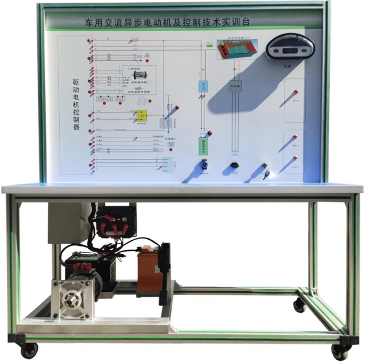 檢測控制面板(裝有各種檢測端子,1448×940mm彩色電路圖和工作原理示意圖)、組合儀表、點火開關(guān)、電機控制器、車載充電器與充電接口、DC-DC轉(zhuǎn)換器、鋰動力電池組、電動車電機(交流異步電動機)、剎車開關(guān)、檔位開關(guān)、油門控制裝置、大電流繼電器、電源總開關(guān)、急停開關(guān)、輔助蓄電池(12V45AH)、一體化全鋁合金型材搭建的移動臺架(1500×700×1700mm (帶自鎖腳輪裝置,帶安裝檢測端子的原理面板,面板1448×940mm)、設(shè)備操作說明書。