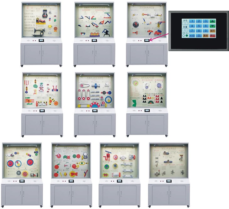 (2)展示內(nèi)容全面。該陳列柜以國家級規(guī)劃教材為依據(jù),對機械基礎課程內(nèi)容進行較全面的展示,包括平面機構(gòu)應用、凸輪、齒輪、液壓元件原理等,提供內(nèi)容豐富的機械基礎基本知識。對不同版本的同名教材具有兼容性;