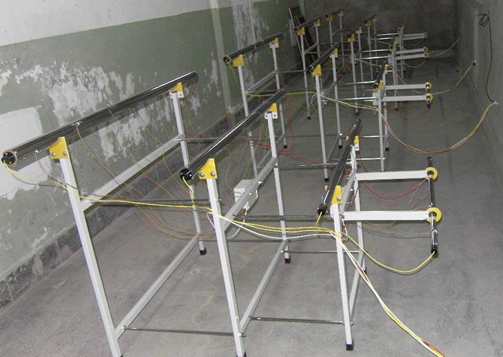 配有四根不同長(zhǎng)度和直徑的電鍍紫銅管,管內(nèi)設(shè)置電加熱器;每根管子的表面裝4~6支測(cè)溫傳感器,以測(cè)定其表面平均溫度,測(cè)溫傳感器采用進(jìn)口DS18B20;每根橫管電加熱器配備電子集成固體調(diào)壓模塊無(wú)機(jī)調(diào)節(jié)。測(cè)試儀表箱設(shè)有(每根橫管電加熱器)數(shù)顯功率表;所有測(cè)試數(shù)據(jù)由7寸觸摸屏同屏顯示,不銹鋼實(shí)驗(yàn)支架。