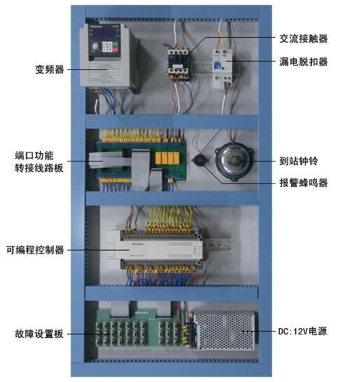 3.電氣控制部分:電源空氣開(kāi)關(guān)(漏電脫扣器)、DC12V驅(qū)動(dòng)電源、PLC可編程控制器、接線端口電路板、到站鐘等。